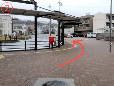 目の前にロータリーがあります。そのロータリー(赤いポストが目印)を左手に真っすぐ進んでください。