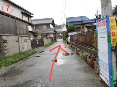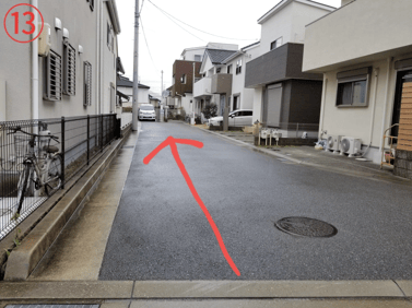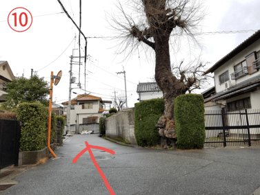 信号を渡ったら、右側の民家の茶色の塀に沿って道なりに進んでください。