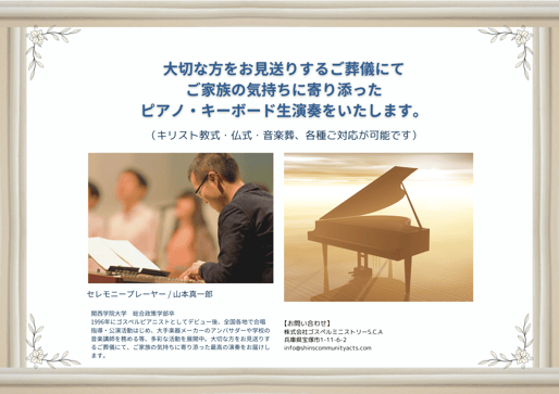 弊社代表の山本真一郎が、大切な方をお見送りするご葬儀にて、ご家族の気持ちに寄り添ったピアノ・キーボード生演奏をいたします。キリスト教式・仏式・音楽葬、各種ご対応が可能です。