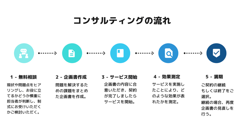 まずは、弊社の担当者がお客様の目標・現状・問題をしっかりヒアリングし、お客様のお役に立てるかどうか慎重に判断します。お役に立てると判断した場合は、担当者がその旨をお伝えしますので、コンサルティングを正式にお受けになるかどうかご検討ください。お返事は即日でも後日でも構いません。