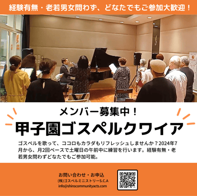 現在、ららぽーと甲子園2Fにある「島村楽器店」にて、土曜日午前中に月2回活動しています!音楽に囲まれた環境の中でゴスペルを一緒に歌いませんか?老若男女・経験有無問わず、どなたでもご参加可能です。随時無料体験レッスンを実施していますので、お気軽にいらしてください♬