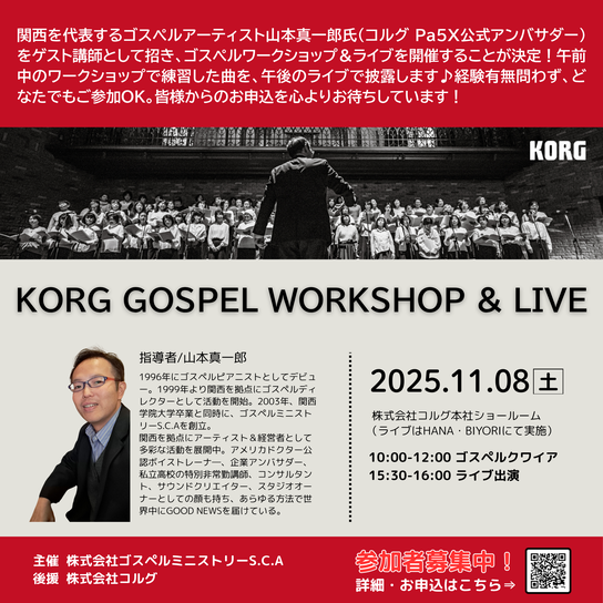 今秋、関西を代表するゴスペルアーティスト山本真一郎氏(コルグ Pa5X公式アンバサダー)による、ゴスペルワークショップ&ライブを開催します。