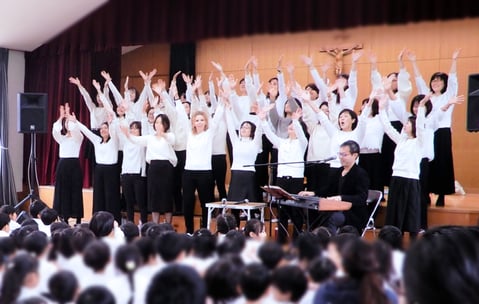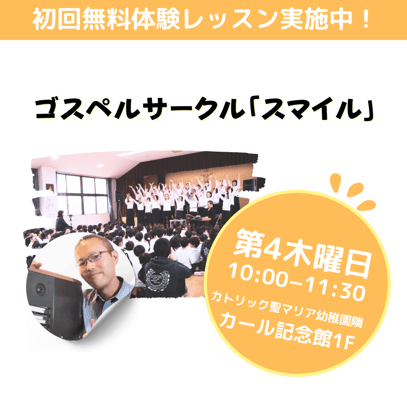 大阪池田にあるカトリックマリア幼稚園で結成されたゴスペルサークルがリニューアルスタート!月1度のペースで、第4木曜日午前中にゴスペルサークル『スマイル』として活動しています。レッスンは、ゴスペルアーティストであり、4児の父としての顔も持つ山本が楽しくていねいに指導します。只今、仲間を募集中!初回体験無料です。どうぞお気軽にお申し込みください(^-^)